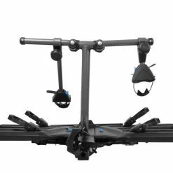 Les vélos s’installent très facilement sur les rails grâce à son mécanisme électrique permettant d’abaisser le porte-vélos au niveau du sol. Une fois les vélos posés, une simple pression du doigt sur un bouton remonte l’ensemble ! Les vélos sont fermement maintenus au niveau des roues par des courroies crantées résistantes et sur les cadres par des bras de fixation réglables et verrouillables à clé. Une longue sangle de sécurité est également fournie pour assurer un bon maintien.